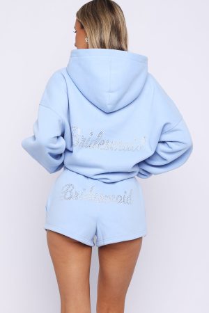 Be my something blue in the Bridal Party Lounge Shorts Light Blue. Features a thin waistband with internal drawstring. hip pockets and a loose relaxed fit. Finished with unlined fleece interior and diamante ‘White Fox’ text side front paired with ‘Bridesmaid’ text centre back. Style with the matching Bridal Party Oversized Hoodie Light Blue.