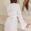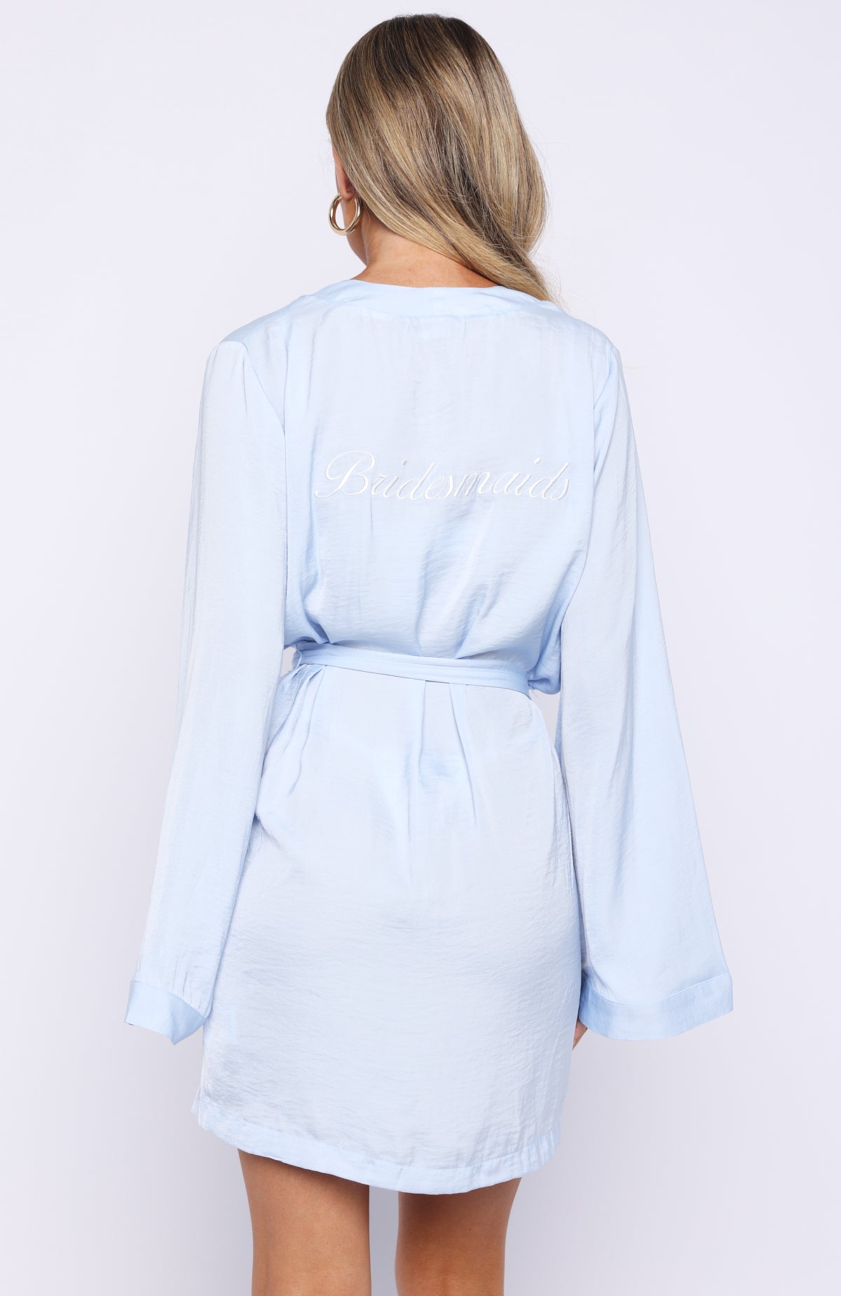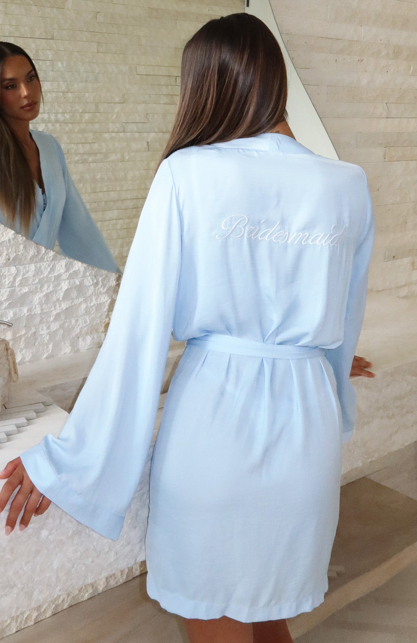 The Bridal Party Robe Baby Blue is a pretty addition to the morning of the wedding! Featuring wrap around design with detachable belt and silk-feel fabric. Finished with embroidered ‘Bridesmaid’ text across the back. We love this paired with fluffy slippers! We are obsessed!