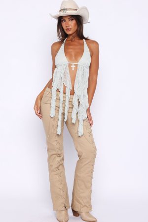 Festival energy in the Bright Lights Halter Top Mist. Features thin self‑tie halter straps. a daring plunge neckline. an adjustable drawstring back strap. playful under‑bust tassel detailing. and an eye‑catching backless silhouette. Style with the Night Moves Pants for a fit that’s made for dance floors and sunset stages alike.