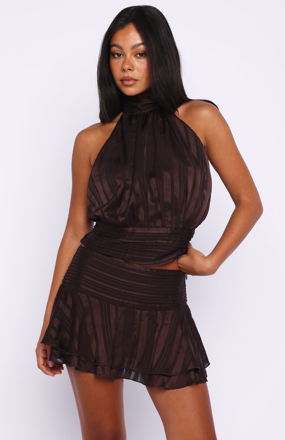 Tags: bottoms, buystructure:fashion, clothing, colour:brown, discountable, discountable_uk, discountable_us, Division:Fashion, end-use:day, fabric-type:main-100-polyester-lining-92-polyester-8-spandex, feed-cl0-newarrivals, feed-cl2-fullpriceau, feed-cl2-fullpriceuk, feed-cl2-fullpriceus, feed-cl4-summer, frill skirt, Going Out Sets, matching-set:yes, mini skirt, Mini Skirts, New Arrivals, new_arrivals_au, new_arrivals_uk, new_arrivals_us, pattern:plain, recently_added_2026-02-11, season:transeasonal, set-mix:top-skirt, sets, size:l, size:m, size:s, size:xl, size:xs, size:xxs, sizeguide:clothes, skirts, skirts-sets, stripe, subcat:mini-skirts, subcategory:Mini Skirts, subcategory:Sets, tone:Chocolate, two-piece-sets