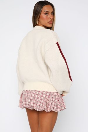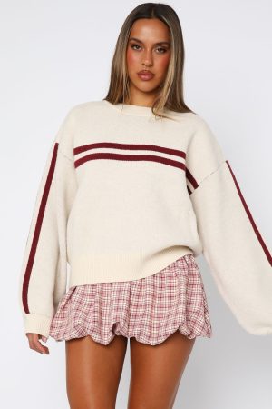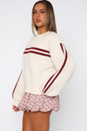 Thick sweaters are a must have this winter! The Bring Me Back Knit Sweater in Cream features a high round ribbed neckline. slouched shoulders. long sleeve with ribbed cuffs. ribbed hemline for a structured waist and stripe design across bodice and down sleeves. Simply pair with a mini skirt and boots for a look we love!