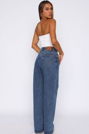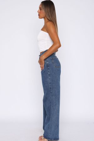 Your most loved just got an upgrade! The Bring The Style High Rise Wide Leg Jeans Admiral Blue features a high waisted design. front zip and button closure. belt loops. wide leg design and 5 pocket design. We love this paired with a cute crop and sneakers for the ultimate IT girl fit!