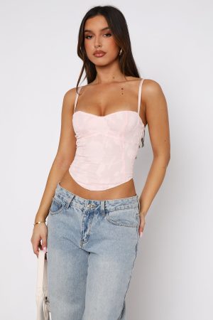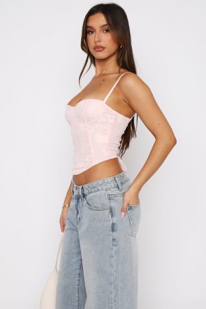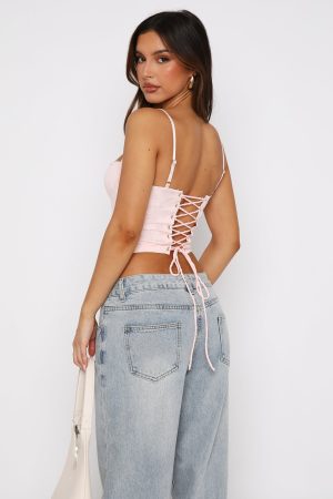 This confidence-enhancing bustier is perfect for all your weekend needs! The Broken Dreams Bustier Baby Pink features a low neckline. thin adjustable straps. centre back lace up design. lined. sheer fabric and cropped fit. Keep it chic and style with black pants and your favourite gold accessories.