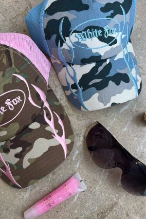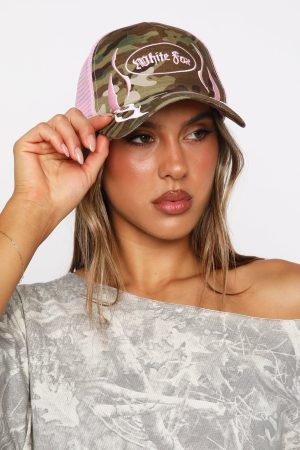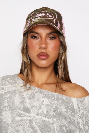 Cool girl vibes only in the Brooks Trucker Cap in Camo/Pink! Features embroidered White Fox text paired with embroidered flame graphic. camo design. mesh back and adjustable closure. We love this paired with one of our mix match festival fits!