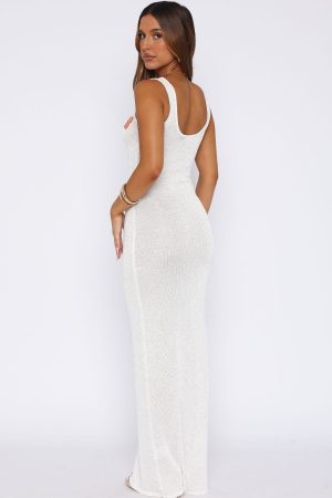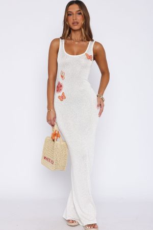 Soak up the sun. then soak in the spotlight! The Butterfly Blossom Sequin Knit Maxi Dress White features thick shoulder straps. a low scooped neckline. maxi length. unlined. slightly sheer material with stretch for an easy slip on design and beaded embellishments.