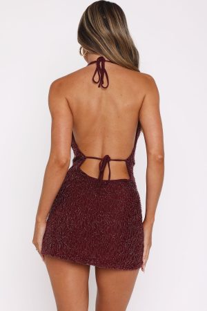 Made for after dark… the By Candlelight Beaded Mini Dress Burgundy features a halter neck design with self tie strap. front cowl detailing. mesh lined. slightly sheer. backless with self tie strap. mini length and stunning beaded material.