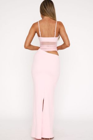 Create a jaw dropping entrance in the Call Me Up Maxi Baby Pink. Features thin adjustable straps. lined bust cups. mesh bodice design. maxi length and side cut out detailing. Pair with a pointed toe heel and mini shoulder bag to have all eyes on you!