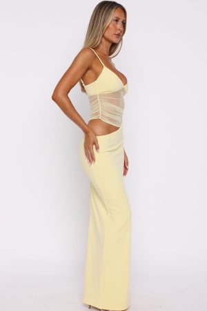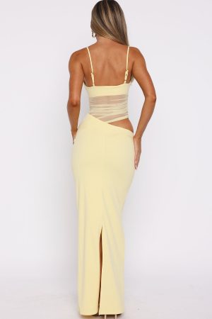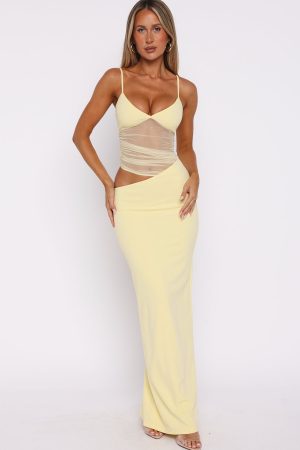 Make a show-stopping entrance in the Call Me Up Maxi in Lemon. With delicate adjustable straps. lined bust cups. and a mesh bodice that leads into maxi length and daring side cut-outs. this dress strikes the perfect balance of sultry and chic. Pair it with heels and layered gold jewellery to command every gaze.
