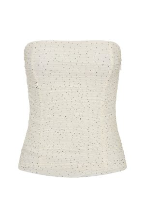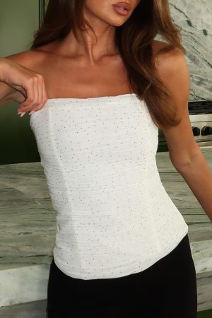 In a summer state of mind! The Camp Crush Strapless Bustier in Cream/Black Polka Dot features a strapless neckline with grip tape. internal boning. and subtle side ruching for a flattering fit. The fitted silhouette is complemented by an invisible side zipper with hook-and-eye closure. and the top is fully lined for comfort. Style with capris. kitten heels and sunnies for a chic summer fit.