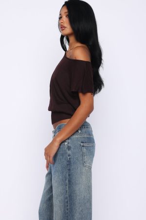 Can’t Change My Mind Off Shoulder Cinched Top Chocolate