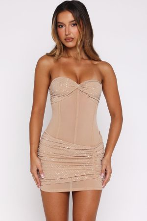 Designed to catch every eye…The Can’t Compare Embellished Mini Dress Beige features a strapless design with gel grip at bust. lined material at bust and skirt. sheer bodice with boning for a figure-hugging fit. diamanté embellished material. mini length. ruched detailing at skirt and side zipper and clasp closure. Let the dress be the main attraction and pair with dainty gold accessories!