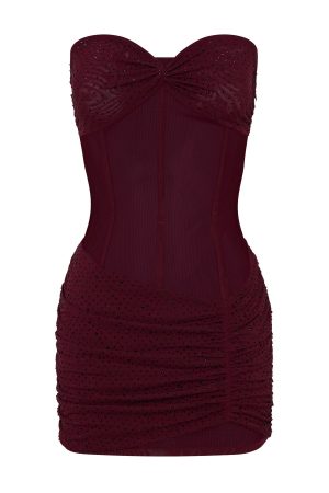 Designed to catch every eye…The Can’t Compare Embellished Mini Dress in Burgundy features a strapless design with gel grip at bust. lined material at bust and skirt. sheer bodice with boning for a figure-hugging fit. diamanté embellished material. mini length. ruched detailing at skirt and side zipper and clasp closure. Let the dress be the main attraction and pair it with dainty gold accessories!