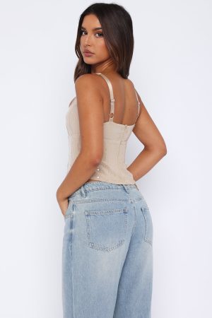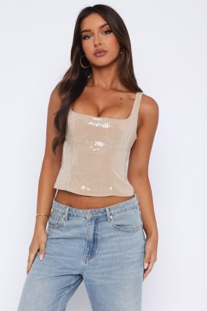 The Can’t Explain It Sequin Bustier Beige deserves a night out! Featuring thick. adjustable straps and lined. sequin fabric. We love this paired with your favourite pair of White Fox Denim Jeans and perspex heels for the perfect outfit for your night girls night out!