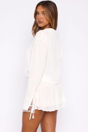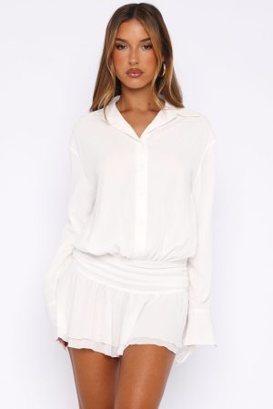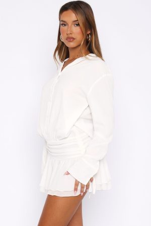 Meet your newest summer fling..The Can’t Get Me Long Sleeve Mini Dress White features a collard neckline. centre front button down closure. long sleeves with self tie detailing at cuff. ruched waistband. invisible side zipper and clasp closure. mini length and light-weight material.