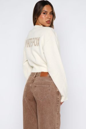 We have fallen in love with the Can’t Help Falling Knit Sweater in White! Features a round ribbed neckline. slouched shoulders. long sleeve with ribbed cuffs. White Fox text centre front and ribbed hemline for a structured waist. Complete the look with denim jeans and layered gold jewellery.