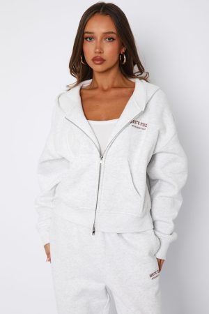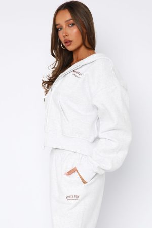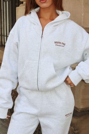 Cosy season is here! The Can’t Miss It Boxy Zip Front Hoodie in Grey Marle/Rose Gold features hood. slouched shoulders. long sleeve with ribbed cuffs. front double ended zipper closure. stitched White Fox text side front. pockets and ribbed waist. Pair with the matching Can’t Miss It Sweatpants or Can’t Miss It Lounge Shorts for a cosy Sunday fit!