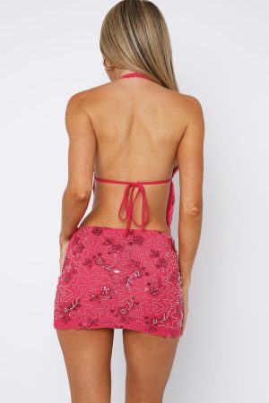 Sparkly summer sets are a must-have! The Capri Cove Beaded Top in Pink features a fixed halter neckline. low plunge. adjustable drawstring straps on bust. backless and beaded floral design. Complete the look with the matching Capri Cove Beaded Mini Skirt for a sparkly look we love!