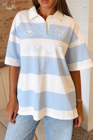 Serve IT girl energy… The Catch A Wink Oversized Short Sleeve Rugby Shirt Blue / White Stripe features short sleeves. buttoned neckline with collar. unlined high stretch fabric and printed White fox text centre front. Pair with denim jeans for a cute vibe worthy of your next insta post!