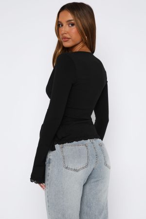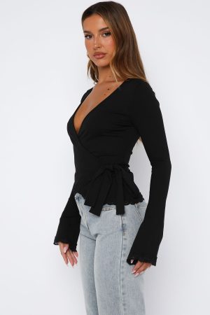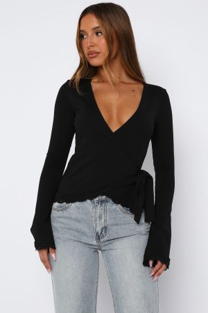 Just in time for the chilly season. add the Cater To You Long Sleeve Top Black to your cart while you still can! Featuring long sleeves. a low plunge V neckline. wrap style front closure. lace trim detailing and stretch material. Style with low rise jeans and sneakers for the full vibe!