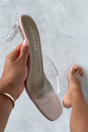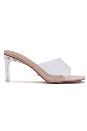Celeste Mules Clear are a staple for every fit. These heels have a high perspex. thin block heel. open square toe design and soft. thick clear vinyl toe strap.