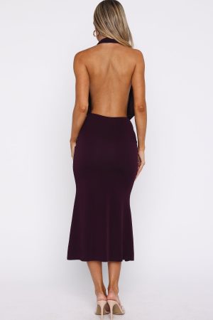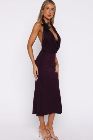 The kind of dress you’ll want to wear long after the party’s over. The Champagne Rush Midi Dress Plum features a halter neck design with an ultra low cowl. plunge neckline. backless design. attached flower detailing. lined material and stretch for an easy slip-on design. Add high shine accessories and perspex heels for a show-stopping look!