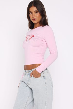 Capture attention from every angle in the Chasing Butterflies Long Sleeve Baby Tee in Pink! Features a classic crew neckline. slim-fitting long sleeves. and a sleek. semi-stretch silhouette. Adorned with White Fox text and a delicate butterfly graphic enhanced by dominates. it strikes the perfect balance between understated cool and whimsical flair. Style with lounge shorts and your fav sneakers for a comfy edge to your casual weekend fits.
