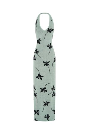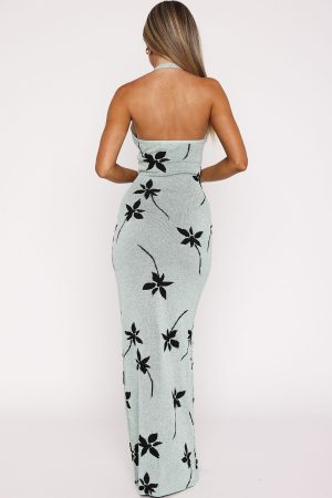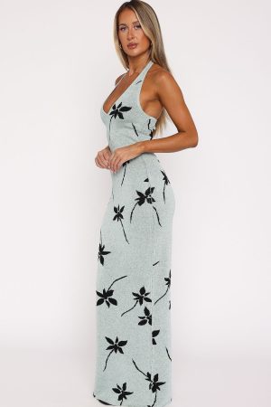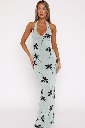 Sunsets and the Chasing Heaven Knit Maxi Dress Mint are a match made in paradise! Features a halter neck design. low plunge neckline. slightly sheer. tinsel embellished for a slight iridescent glow. maxi length. stretch material for an easy slip on design and a figure hugging fit.
