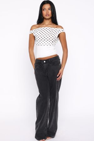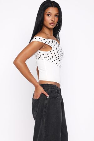 Our Cherry Charm Top in White Polka Dot is the perfect blend of cute and feminine! This stunning top can be styled on or off the shoulder. has a fitted waist for a cinched look. unlined chiffon material and low v back for a backless moment. Pair with your fav White Fox denim jeans and kitten heels for a cute girls long lunch!