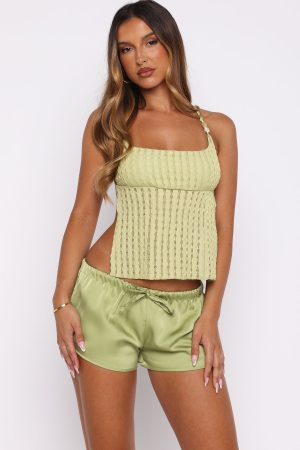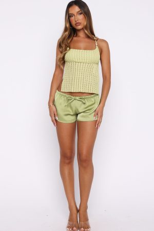 From beach days to brunch dates. the Chill Squad Shorts in Pistachio are your go-to. Crafted from silky fabric. they feature a thin elastic waistband with an external drawstring tie for a comfortable fit. The mini-length design offers a relaxed silhouette. while the fully lined interior ensures comfort. Style with the Spot The Difference Backless Top. sandals and layered gold jewellery for the perfect summer fit.