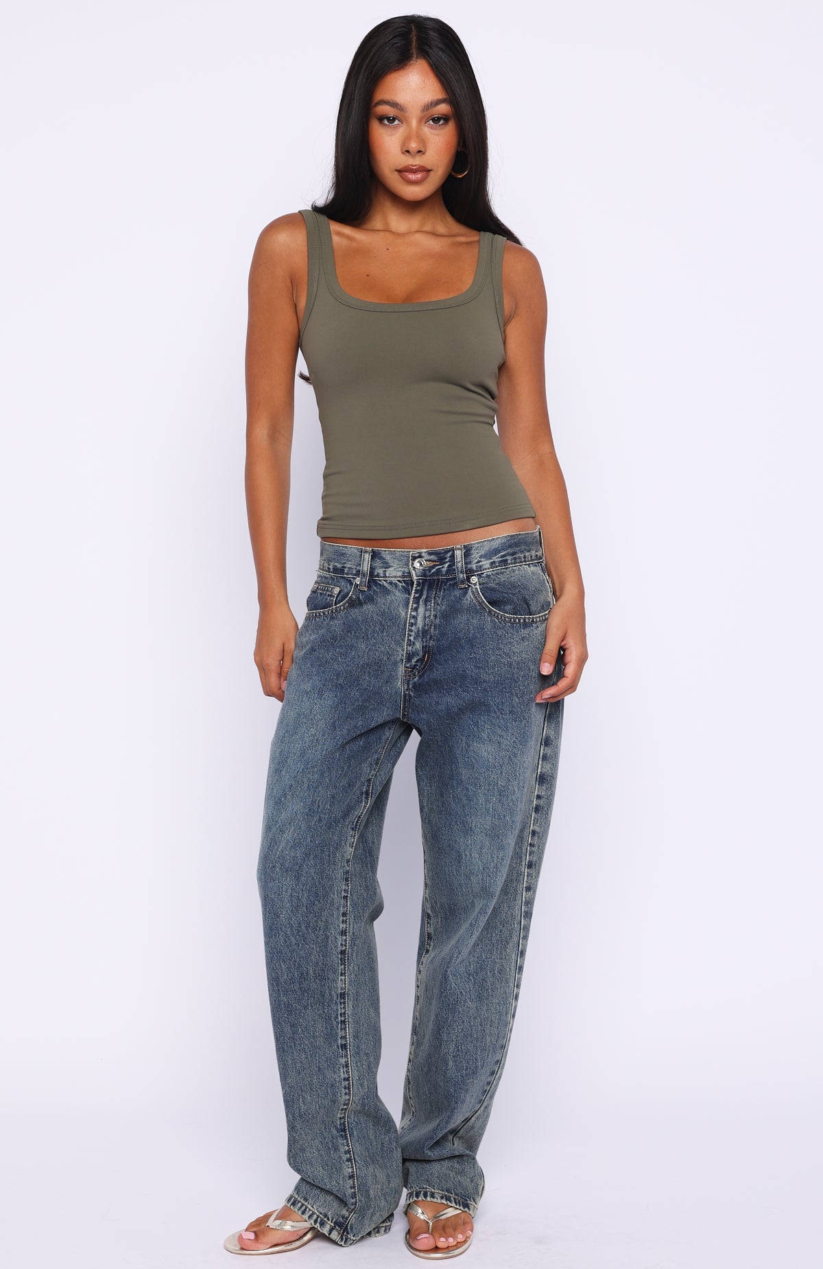 Everyday essentials. elevated. The Chill Vibes Tank Top in Khaki features thick shoulder straps. a flattering scoop neckline. and a sculpted. fitted silhouette crafted in a high‑stretch. fabric with a thick lining for a smooth finish. Pair it with your favourite low‑rise denim or tailored pants and layer on gold accessories to complete your elevated basics look.