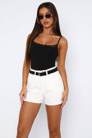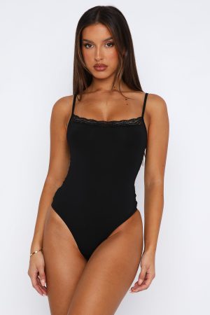 The Clocked In Lace Trim Bodysuit Black is a year round staple. Features thin adjustable straps. scoop neckline. lace trim detailing. unlined. super soft and silky fabric. high stretch material and snap button closure at crotch. Keep it simple with your go to White Fox jeans and platform flats.