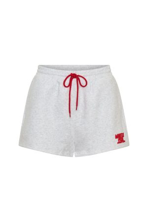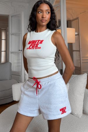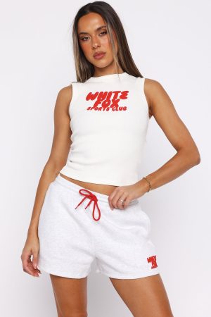 Ideal day in the Club 14 Allie Lounge Shorts Grey Marle. Designed with a thick elasticated waistband featuring an contrast-colour external drawstring tie. side hip pockets. and a relaxed silhouette. The White Fox puff print text at the side adds a signature touch. while the unlined fleece interior ensures a cozy feel. Style with the matching Club 14 Allie Tank Top for the perfect coordinated fit.