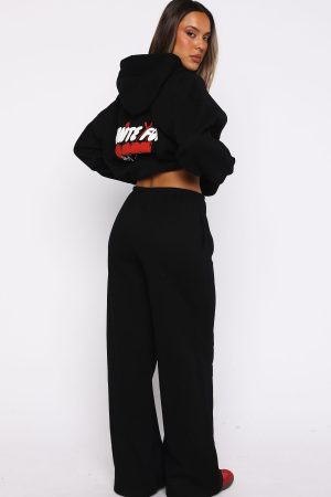 Easy like Sunday mornings in the Club 14 Cassie Wide Leg Sweatpants in Black. Designed with a thick elasticated waistband featuring an internal drawstring tie. side pockets. and a wide-leg silhouette. The bold White Fox puff-print text at the side paired with cherry graphic adds a signature touch. while the unlined fleece interior ensures a cozy feel. Style with the matching Club 14 Cassie Boxy Hoodie for the perfect sporty street style look.