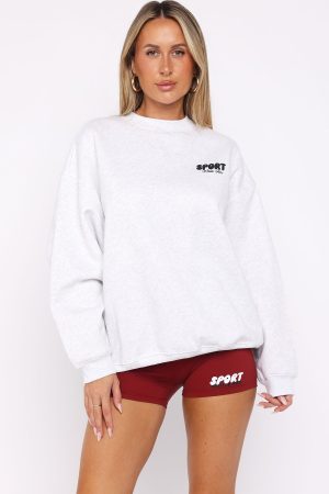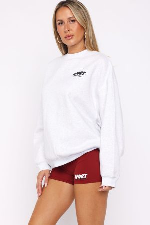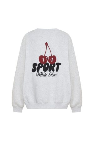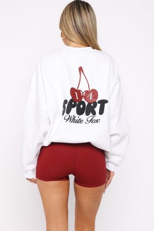 Loungewear. weather state of mind! The Club 14 Peyton Oversized Sweater Grey Marle is designed with a ribbed crew neckline. drop shoulders and ribbed hems. which round out an oversized silhouette. Featuring long sleeves and an unlined fleece interior. this sweater delivers a cozy feel. Finished with puff print Sport White Fox text side front. paired with an oversized cherry graphic centre back. Style with the Club 14 Peyton Bike Shorts for a cosy look.