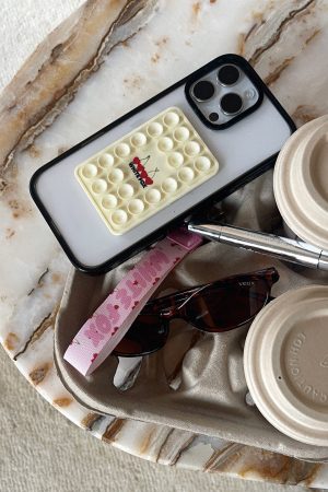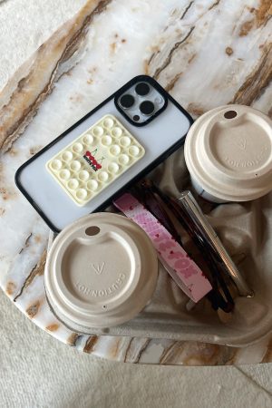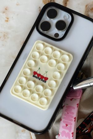 Whether you’re snapping selfies. recording workout sessions. or applying makeup. the Club 14 Taylah Phone Grip Lemon is your bestie! Features front sided suction cups. flat adhesive back and printed White Fox text paired with cherry graphic centre front. We are obsessed!