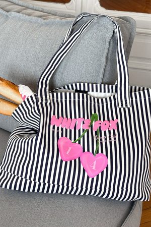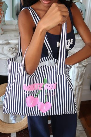 BRB adding to cart! The Club 14 Trinity Tote Bag in Navy features comfy shoulder straps and bold White Fox text with cherry graphic. Simply pair with your fave Club 14 lounge set for a cozy look.