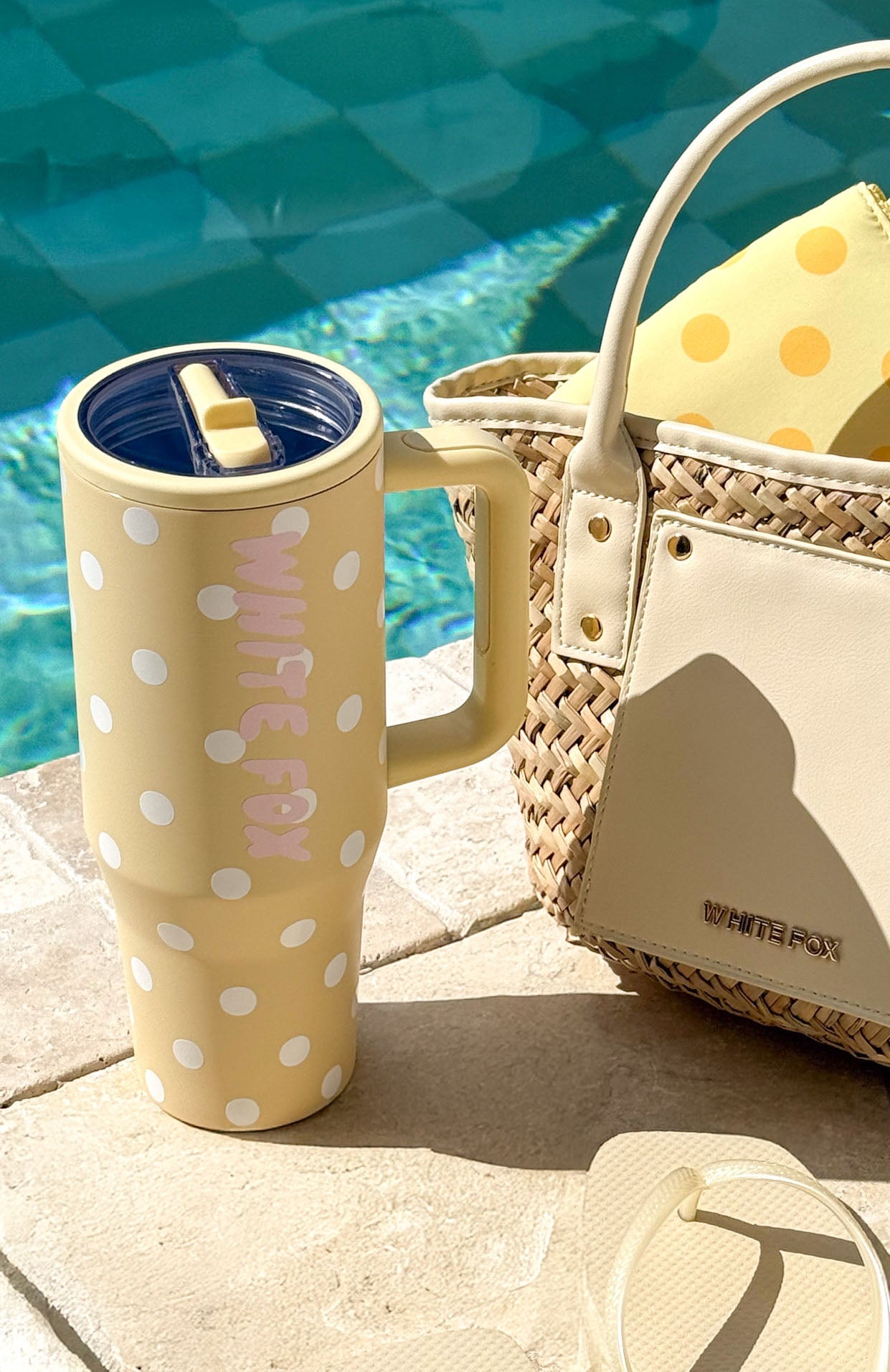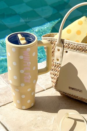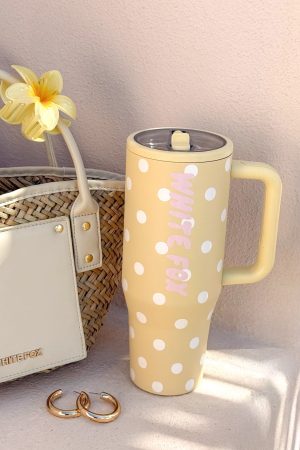 Cousins Beach. bikini on. and your new fave drink bottle in hand! The Colson Drink Bottle 1.2L in Lemon Polka Dot features a screw-off lid with a flip straw. oversized handle. and cupholder-compatible design. Finished with White Fox text down the side and a playful polka dot print. it’s the ultimate summer essential.