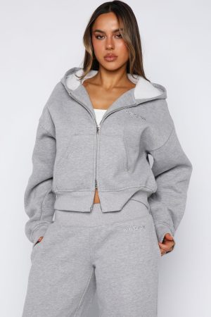 Slip into the Come A Long Way Boxy Zip Front Hoodie in Grey Marle and redefine cosy-chic. Featuring a roomy hood and slouched shoulders. long sleeves with ribbed cuffs. and an effortless center-front zipper closure. The thick ribbed waistline and stitched White Fox text add signature streetwear flair. while side pockets add function. Pair with the matching Come A Long Way Wide Leg Sweatpants in Grey Marle for the ultimate coordinated lounge set.