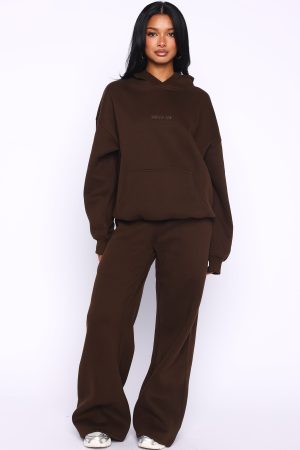 Loungewear weather state of mind. The Come A Long Way Oversized Hoodie Chocolate is designed with a double lined hood. slouched shoulders and firm ribbed hems which round out an oversized silhouette. Featuring long sleeves. a roomy front pocket. and an unlined fleece interior. this hoodie delivers a cozy feel. Finished with White Fox embroidered lettering centre front. Style with the matching Come A Long Way Wide Leg Sweatpants and slippers for a cosy Sunday look.