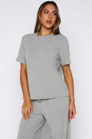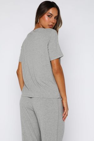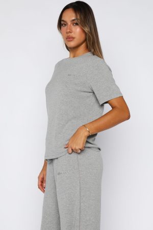 Self-care moments made better. The Come A Long Way Soft Lounge Ribbed Tee in Grey Marle features a round neckline. slouched shoulders. short sleeve. stitched White Fox text side front and the most buttery soft fabrication for all night comfort. For a matching moment pair with Come A Long Way Ribbed Wide Leg Pants Dark Grey Marle.