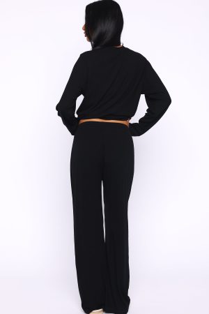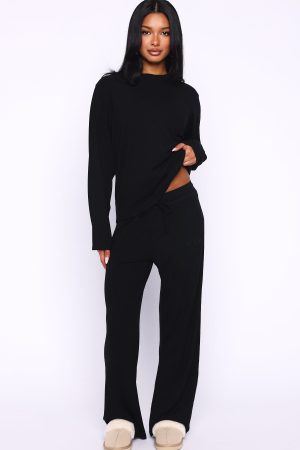 Self-care moments made better. The Come A Long Way Soft Lounge Ribbed Wide Leg Pants in Black features thick elasticated waistband with drawstring tie closing centre front. stitched White Fox text side front. wide leg design and the softest buttery fabrication for all night fabrication! Have a matching moment by pairing with Come A Long Way Relaxed Long Sleeve Ribbed Tee in Black.
