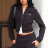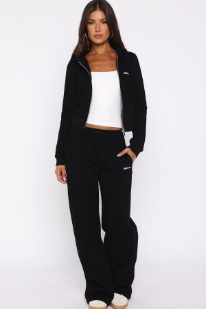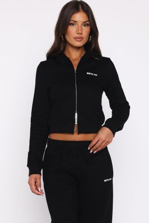 Your new go-to for laid-back luxe. The Comfy And Cute Slim Zip Front Hoodie Black is designed with a relaxed hood. slouched shoulders and ribbed hems which round out an slim silhouette. Featuring long sleeves. front zipper closure. and an unlined fleece interior. this hoodie delivers a cozy feel. White Fox embroidered text embellishes the side front. Style with the matching Comfy And Cute Wide Leg Sweatpants Black.