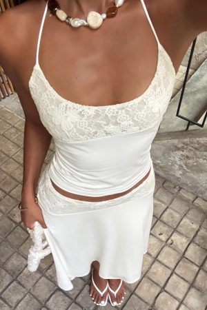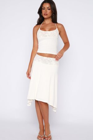 Better late than underdressed. The Cool Chaos Halter Top Off White features thin self-tie halter straps for an adjustable fit. a scoop neckline elegantly trimmed with lace. and a fitted silhouette that flatters the figure. The lined bodice provides comfort. while the open back adds a playful touch. Style with the matching Cool Chaos Midi Skirt for a summers look!