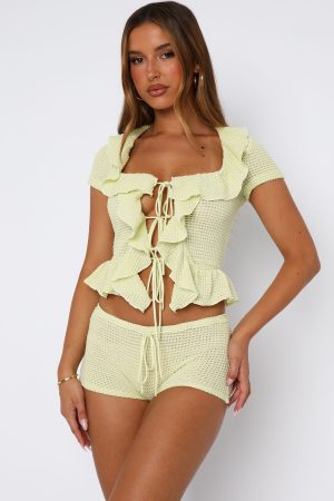 You can’t go wrong with the Cool It Crochet Short Sleeve Top in Lime. Features a square neckline. cap sleeve. ruffle detail down centre front and three self tie bows to make your waist cinched. Complete the look with the matching Cool It Crochet Shorts Lime for a look we love!