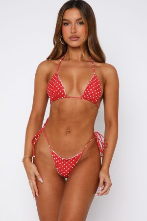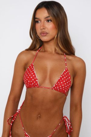 Double the cuteness. double the fun! The Coolum Reversible Bikini Top in White/Red Polka Dot features a triangle design. halter neck style with thin. adjustable self tie straps and reversible colour-way. To compliment the top pair with one of our Avoca Reversible Bottoms in White/Red Polka Dot for the perfect poolside look!