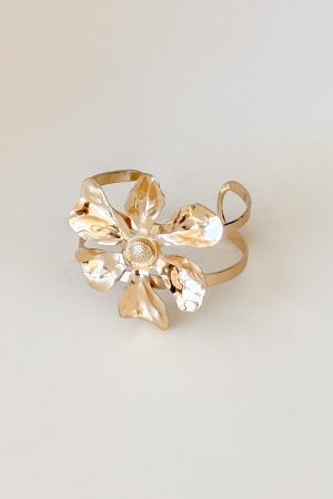 Make a statement this summer with the Cosette Bracelet in Gold. Features a bold cuff adorned with an oversized floral design in polished gold hardware. Pair it with a matching bikini and a breezy cover-up for a luxe beach-club look that’s equal parts chic and effortless.