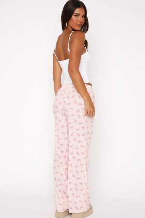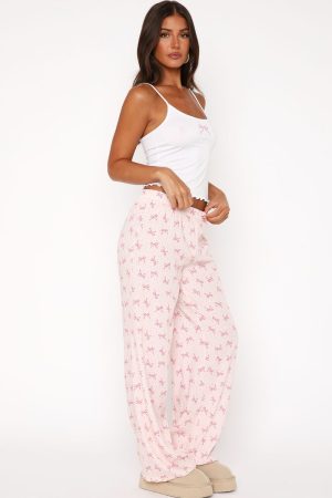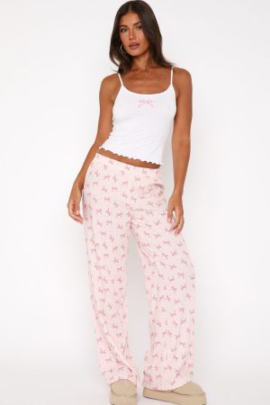 The Cosy Night In Pyjama Set Bow Dreams features thin adjustable shoulder straps. cropped length. unlined. lettuce hem detailing. centre front printed design. thick elasticated waistband. full length and the cutest printed design. Pair with snug boots and your favourite book for a cosy night in!