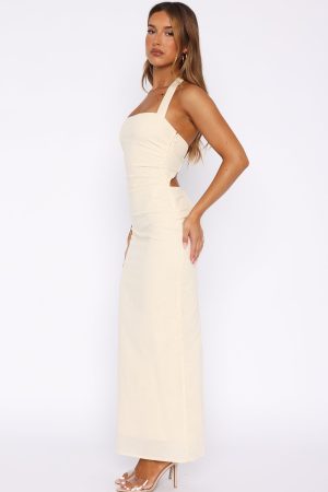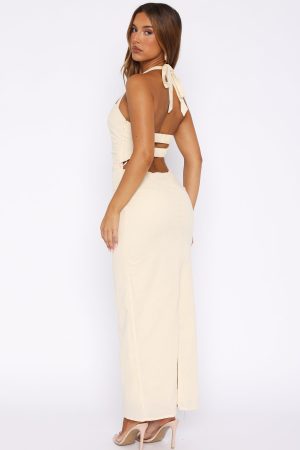The Counting On It Halter Maxi Dress Cream features a halter style neckline with self-tie straps. straight cut neckline. backless design with a double panel design. hidden side zipper with hook and eye. lined fabric. ruched side design and a flattering hugging fit for a look we adore.