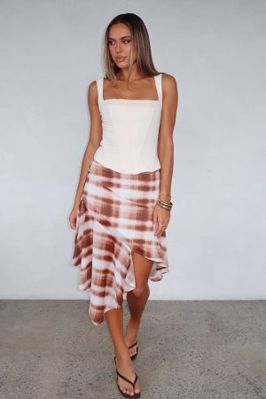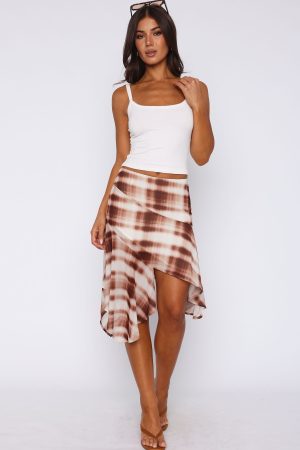 The Crazy Romantic Midi Skirt in Chocolate Plaid is the summer wardrobe essential you will reach for time and time again! Features a balanced asymmetrical silhouette for dimension. invisible zipper with hook and eye closure and lined. Enhance the romantic feeling by pairing with a basic tank and sandals.