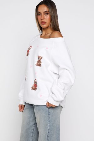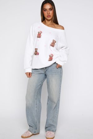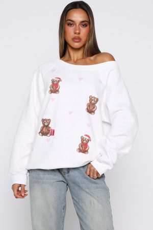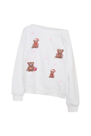 Bring festive flair to your holiday gatherings with the Cuddly Christmas Off Shoulder Sweater in White. This cozy piece features a relaxed off-shoulder neckline. ribbed cuffs. hem. and neckline. and a playful printed teddy bear graphic with White Fox text. Its oversized fit and soft fleece interior ensure comfort and warmth. Pair it with the Cuddly & Cosy Pyjama Pants in Sweet Teddy and slippers for the perfect Christmas loungewear ensemble.